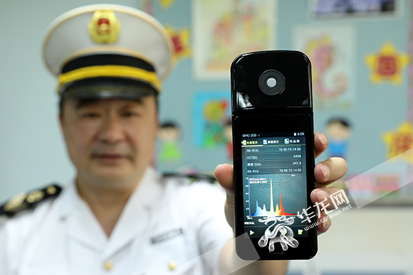 执法人员拿着色温计测光仪测验教室指标。华龙网-新重庆客户端记者 谢鹏 摄
