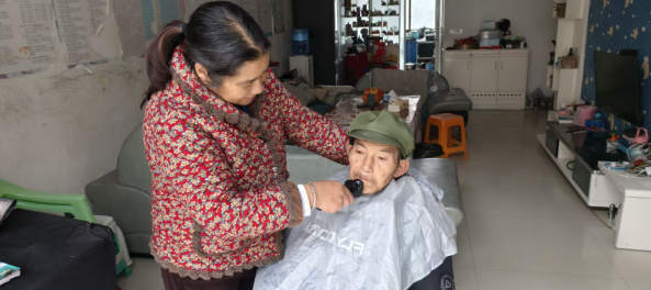 范知琼为大哥剃胡子 供图 城口县河鱼社区