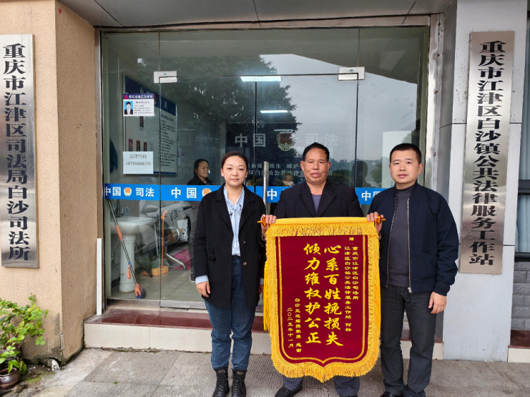 白沙司法所工作人员何矜左(一)获赠锦旗 供图 江津区司法局