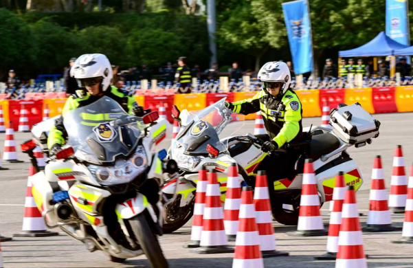 在“渝警骁骑”实战技能赛场上,骁骑队员熟练驾驶摩托车精准转向、适时刹车加速,灵活穿梭之字桩、环形8字桩、限宽直角桩、梅花桩等竞赛路线,快速高效疏导交通、处理事故,充分展示了骁骑队员面对复杂交通状况时的应急处置能力。