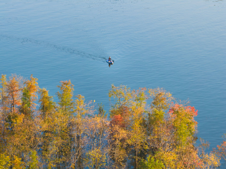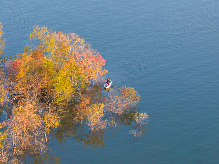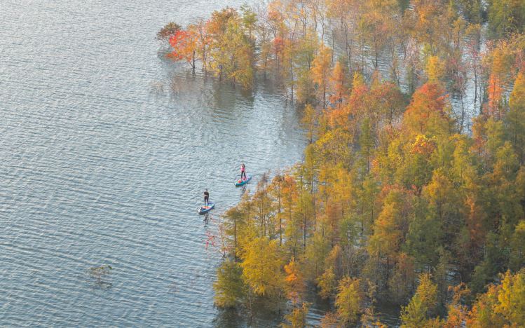 11月21日,开州区汉丰湖国家湿地公园层林尽染,游客划着桨板穿梭在水上彩林间,仿佛进入梦幻般的油画世界。特约摄影 王晓宇