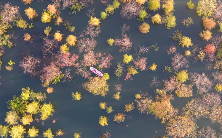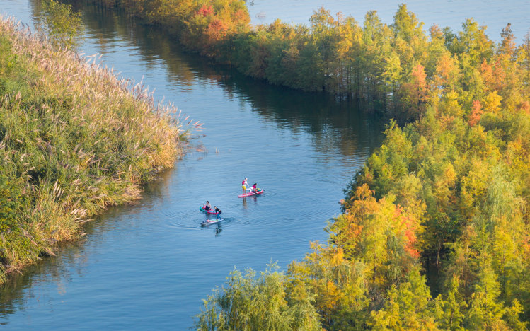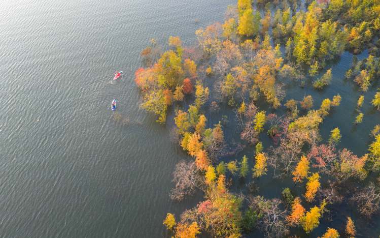 2025年11月21日,开州区汉丰湖国家湿地公园层林尽染,游客划着桨板穿梭在水上彩林间,仿佛进入梦幻般的油画世界。特约摄影 王晓宇