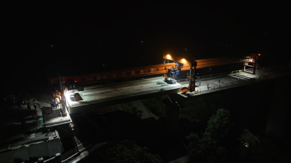 渝万高铁站前3标承担498孔箱梁架设任务,自2024年6月首孔箱梁开始架设以来,项目部聚焦“高标准、高质量,倾力建造西南艰险山区生态铁路精品工程”的目标,面对交叉施工频繁、大坡道、隧道多且运距远等不利因素,通过标准的作业流程、严格的过程控制及精细化的管理,常态化抓好人员安全培训教育和领导带班作业,使架梁施工顺利进展。在架梁过程中以工程进度、安全质量、成本控制为重点,精准把握施工节点目标,科学制定施工计划,以箱梁架设标准化管理为导向,严格落实“领导带班”制度,实行“两班倒”24小时连续作业,严把施工安全质量关,确保箱梁架设任务安全优质高效完成。