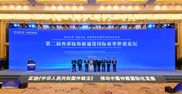 11月21日,第二届西部陆海新通道国际商事仲裁论坛在重庆举办。论坛由重庆市司法局、重庆市法学会、重庆仲裁委员会(重庆国际商事仲裁院)、西南政法大学、重庆市律师协会联合主办。本次论坛主题为“共享机遇、共促发展,共建国际商事仲裁服务新高地”,主要围绕合作协议签署、建设成果发布、专家队伍建设和制度研讨等重点内容,集中展示国际商事仲裁中心建设新进展、新成效。来自境内外的仲裁机构、司法部门、高等院校、律所及企业代表200余人参加论坛。