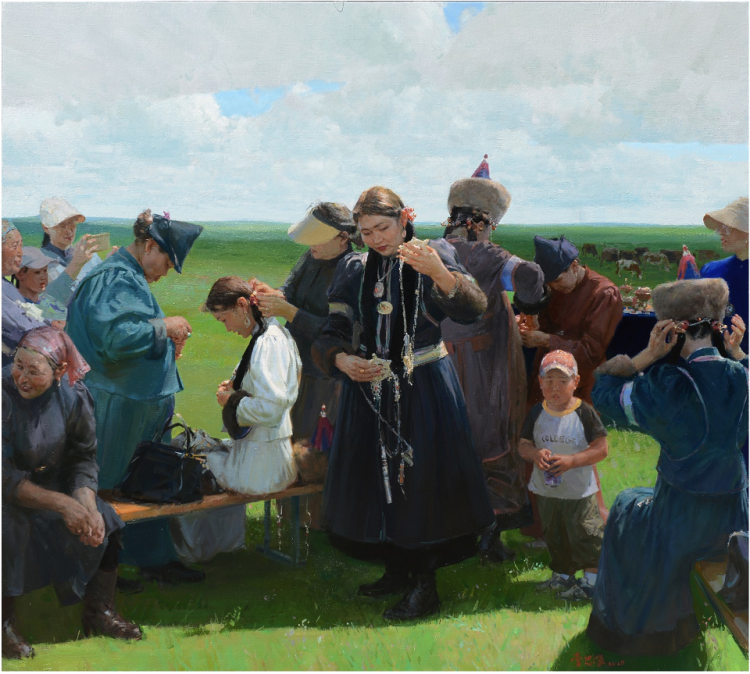 在现场展出的作品中,既有对国家建设成就、乡村振兴生动场景进行的全景式描绘,也有对生态保护等领域的审视。从《同频共振》等刻画劳动场景的作品,到《我们沐光而行》等描绘人民幸福生活的作品,均勾勒出新时代昂扬的精神风貌。作品《云上直播10.1》《未来工程师》等表达了青年艺术家对互联网数字技术、人工智能、航天发展等题材的关注。《不息的光芒——大足石刻的一天》等作品则侧重于对传统经典的挪用。青年艺术家们在媒介语言上持续深耕,拓宽了当代美术创作的表达路径。