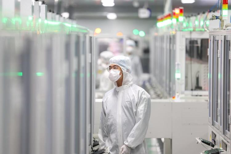 12月2日,在重庆新视通智能科技有限公司SMT(表面组装技术)生产车间,工人在操作自动贴片机。新华社发(李晓果摄)