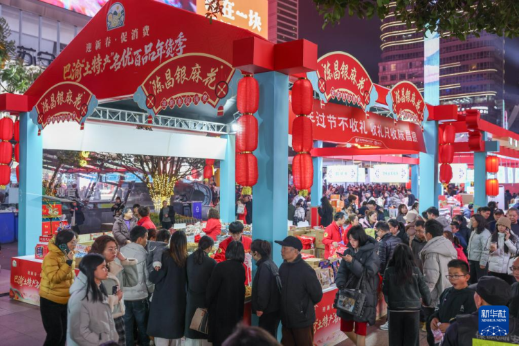 2月1日晚,重庆市两江新区观音桥步行街,市民在现场选购巴渝“土特产”。新华社记者 陈诚 摄
