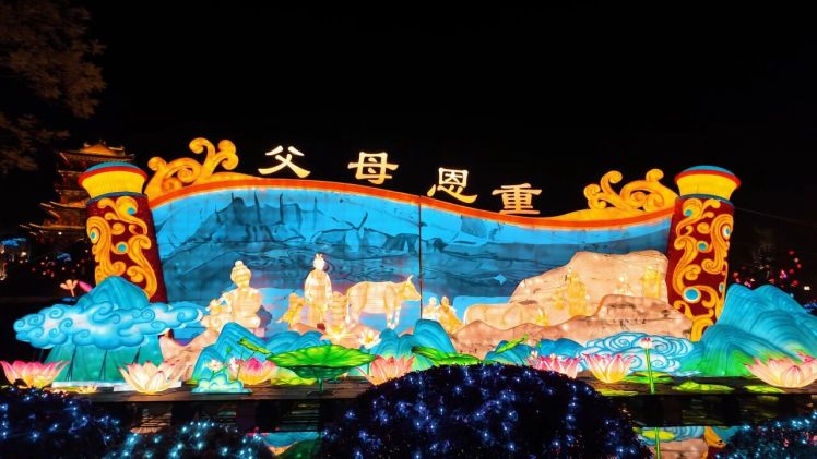 其中,40米长、12米高的父母恩重经变相灯组柔映孝亲图景,卧佛灯组静谧庄严,吹笛女灯组灵动飘逸,“水上+岸上”双景联动,水中的倒影与灯组相映成趣,让千年石刻在光影中“活”了起来,实现了传统文化与现代科技的碰撞。