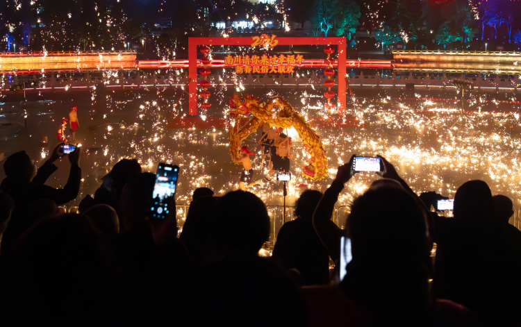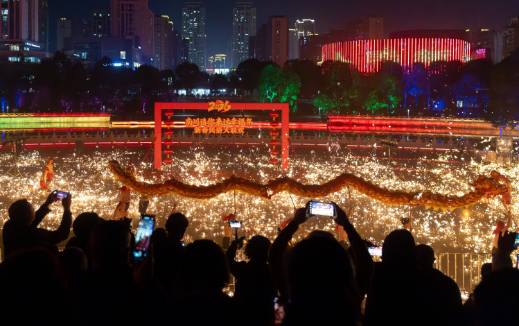 ▲2月22日晚,南川区市民广场,精彩的火龙表演吸引市民游客纷纷驻足拍照欣赏。特约摄影 罗川