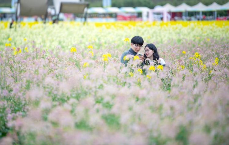 3月9日,游客在油菜花田游玩。新华社记者 唐奕 摄